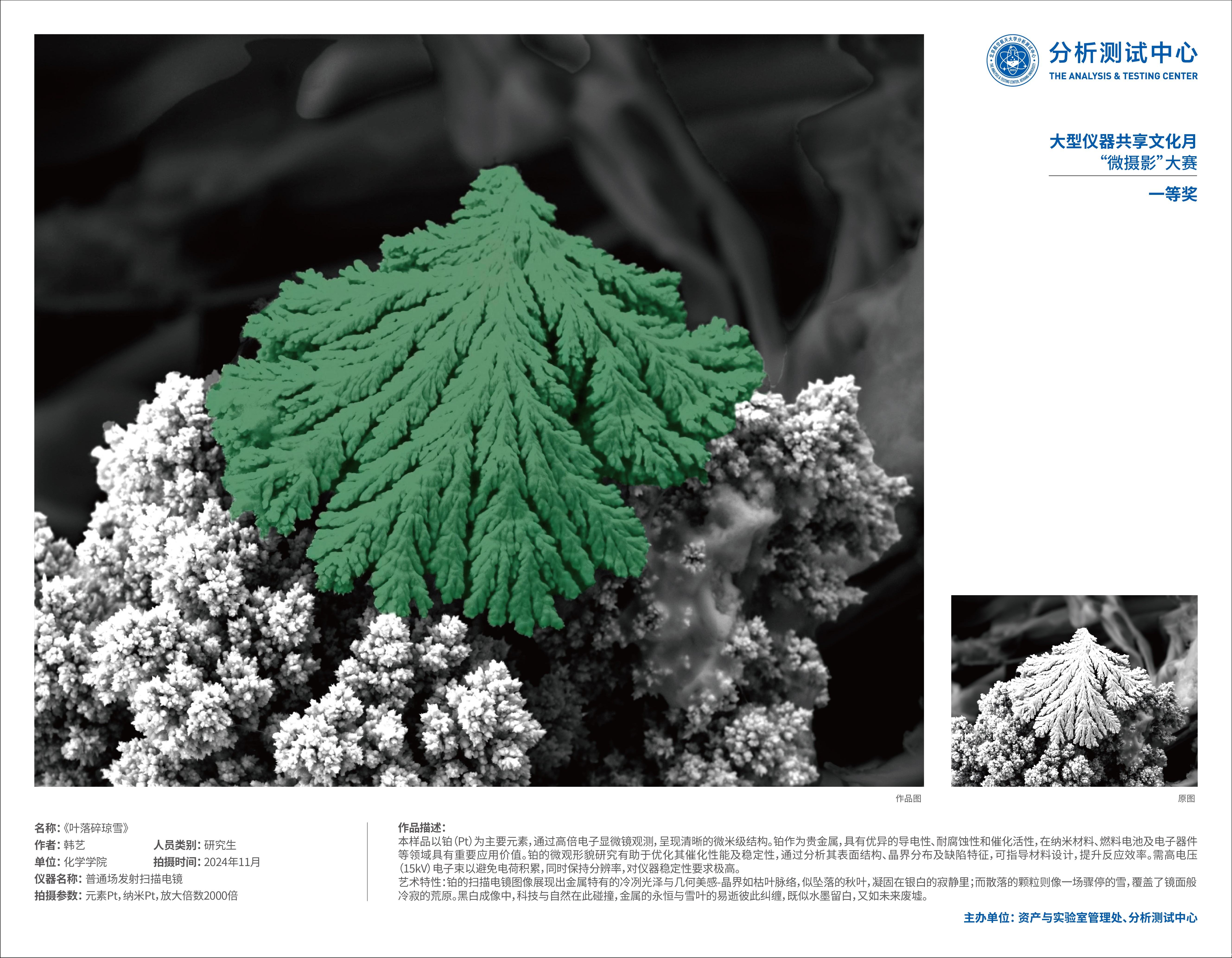 开云体育手机APP网页网6月10日电(通讯员 陈歆)为深入推进大型仪器设备开放共享工作,资产与实验室管理处、分析测试中心联合举办“大型仪器共享文化月”之首届“微摄影”大赛活动。大赛活动发布以来,经过为期一个月的作品征集,共收到来自全校10个单位的师生投稿作品。作品来源主要涵盖扫描电镜、透射电镜、激光共聚焦显微镜、原子力显微镜、飞行时间二次离子质谱、CT等科学仪器和测试设备。经专家评审,大赛最终评选出一等奖2个、二等奖4个、三等奖6个、优秀奖10个。获奖作品成像质量高,作者想象力丰富,充分展示了微观世界中的美丽和神奇景象!
