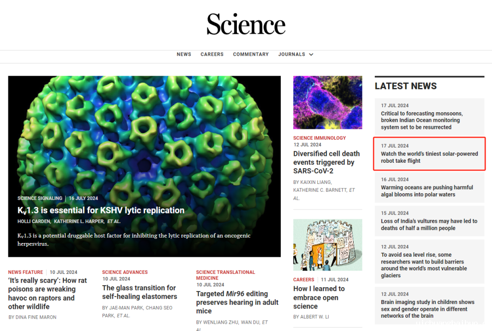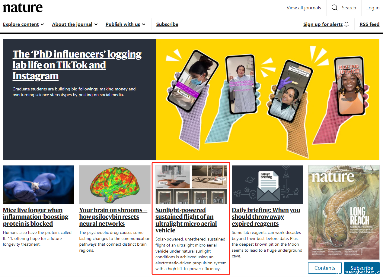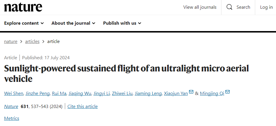开云体育手机APP网页网7月19日电(航宣)2024年7月17日,《Nature》杂志报道了kaiyun网页版登录入口能源与动力工程学院程漆明净、闫晓军课题组研发出太阳能动力微型无人机,相关成果以Article形式在线发表于《Nature》杂志,并同时获Nature和Science首页推荐。