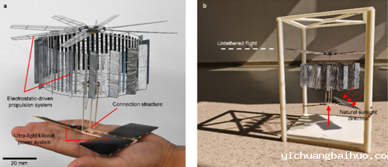 为了解决上述难题,北航科研团队从微型发动机的原理方面寻求突破,提出一种新的静电驱动方案,研制在微小尺寸下转速低、发热小、效率高的微型静电电机,并成功试飞静电飞行器“CoulombFly”。该飞行器主要由静电发动机和超轻质高压电源组成,具备低功耗(0.568瓦)和高升力(30.7克每瓦)优势,首次实现了微型飞行器在纯自然光供能下的起飞和持续飞行。