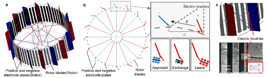静电发动机的核心是静电电机,它是一种依靠静子和转子间的库仑力(Coulomb force)来产生连续旋转运动的新型微型电机,具备结构简单和无需绕组的优势,其高电压(千伏级)、低电流(微安级)的工作特性也使其在工作过程中发热少且无明显红外特征。相比传统电磁电机,静电电机表现出了颠覆式的效率和功耗特性,在小质量(5克以内)情况下,其能量转化效率可达传统电磁电机的10倍以上,产生相同升力所需功耗仅为电磁电机的1/10以内,因此即便采用小尺寸太阳能电池,也可以为微型飞行器提供飞行所需功率。