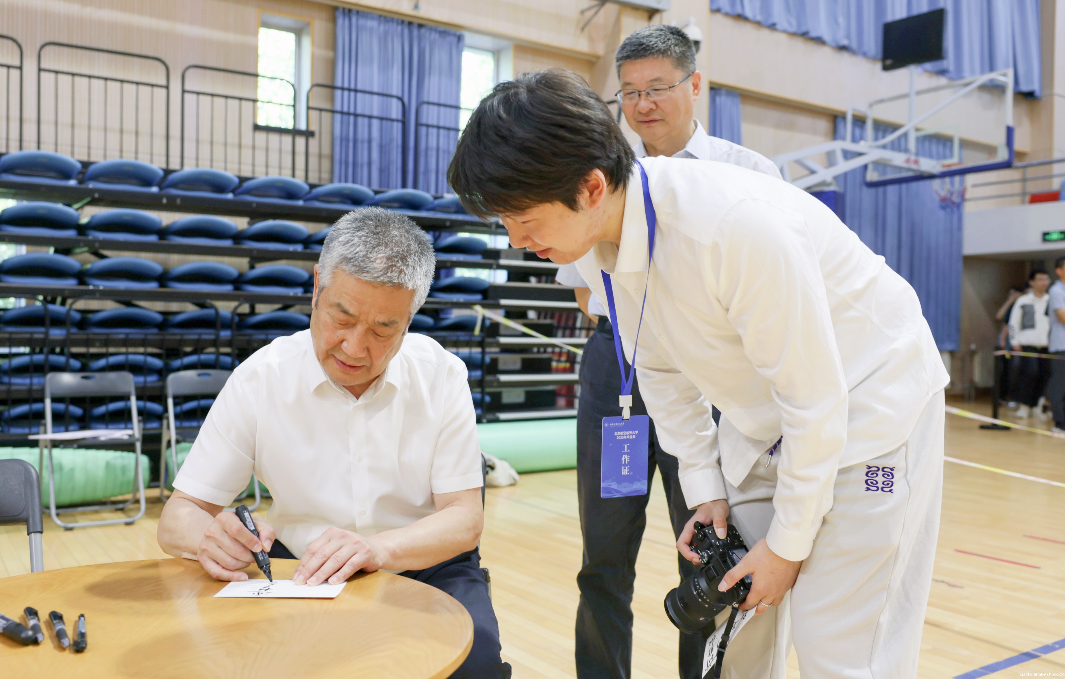 合影间隙,毕业生们满怀感恩与不舍,纷纷来到校领导与师长身旁,热情邀请师长合影留念,用镜头定格下珍贵的师生情谊,并表达对母校辛勤培育的由衷感谢和对学校事业蒸蒸日上的美好祝愿。学校领导老师为毕业生们题写临别赠言,并与大家亲切交谈,勉励大家始终秉持“德才兼备,知行合一”的校训,赓续以“空天报国”为内核的北航精神,心怀“国之大者”,勇担时代重任,在科技创新的星辰大海里奋楫笃行,在服务国家战略需求的广阔天地中建功立业,努力成长为可堪大用、能担重任的栋梁之才。