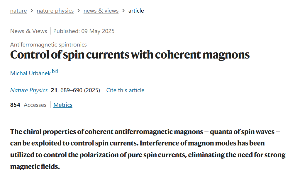 2.Urbánek, M. Control of spin currents with coherent magnons. Nat. Phys. 21, 689–690 (2025). https://doi.org/10.1038/s41567-025-02898-6